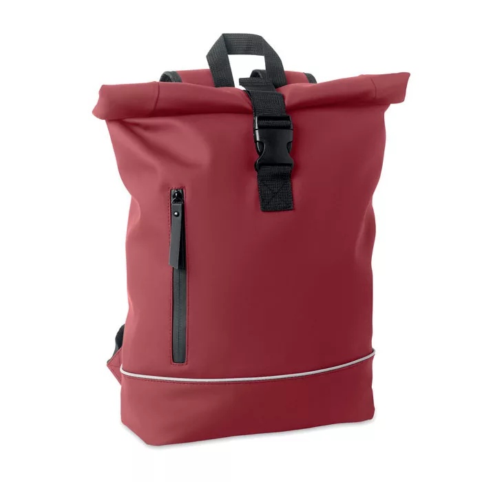 15 colos, rolltop csavart záródású laptop hátizsák puha PU anyagból, párnázott hátoldallal és megerősített, fényvisszaverő csíkkal ellátott aljjal. Vízálló cipzáras elülső zseb. 210D RPET poliészter bélés.