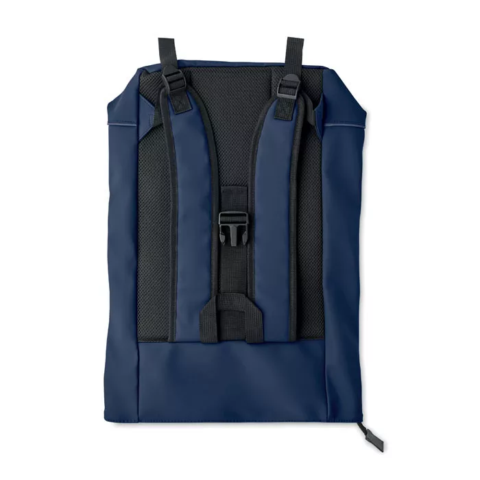15 colos, rolltop csavart záródású laptop hátizsák puha PU anyagból, párnázott hátoldallal és megerősített, fényvisszaverő csíkkal ellátott aljjal. Vízálló cipzáras elülső zseb. 210D RPET poliészter bélés.