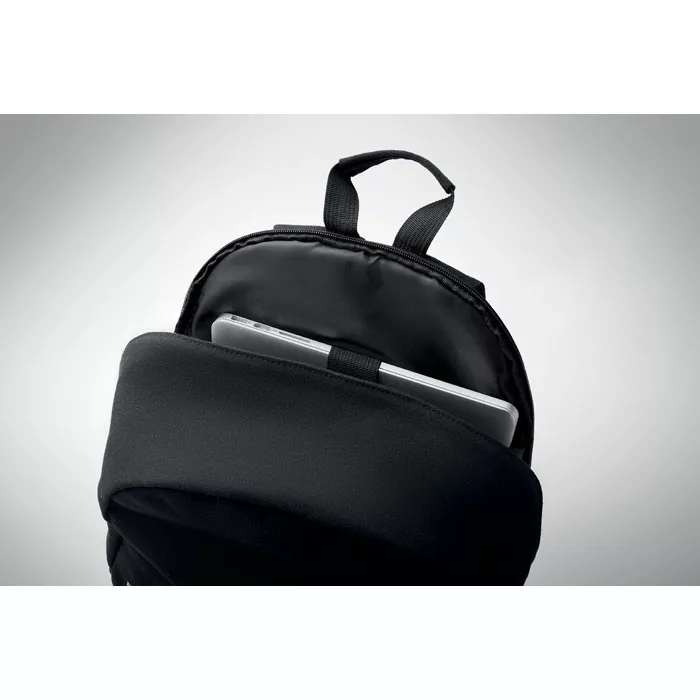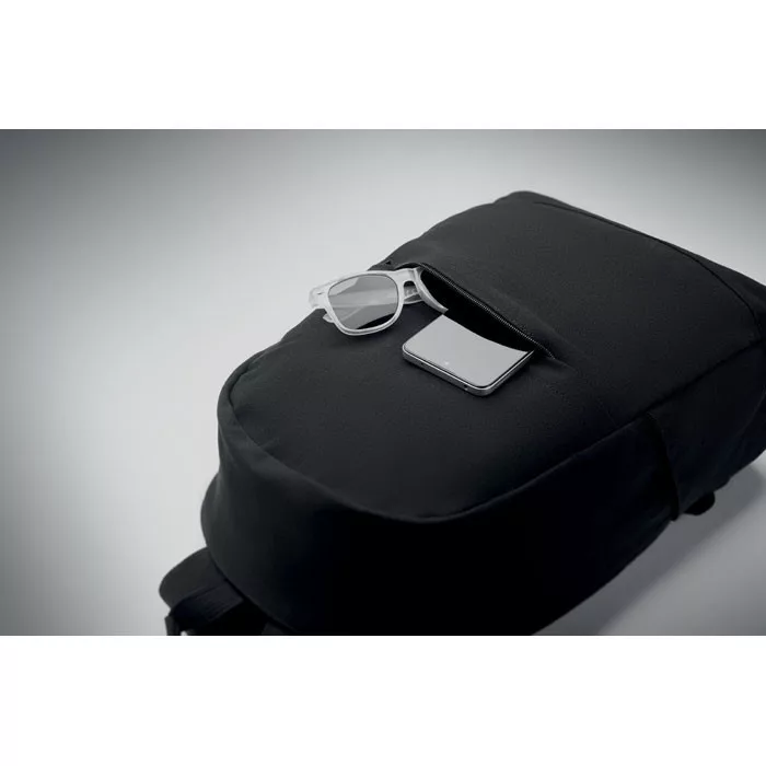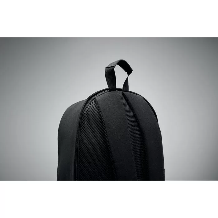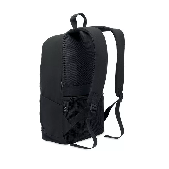 15 colos laptop hátizsák 70% fogyasztás előtti újrahasznosított pamutból és 30% újrahasznosított poliészterből. Elöl cipzáras zsebbel. Puha párnázott hát és vállpántok. Hátoldalán gurulós bőröndre illeszkedő pánttal.