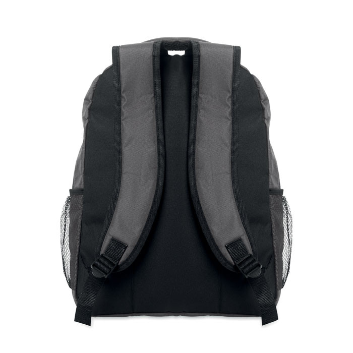 15 colos laptop hátizsák, 600D RPET poliészterből, párnázott laptop rekesszel, mindkét oldalán hálós zsebekkel és cipzáras elülső zsebbel.