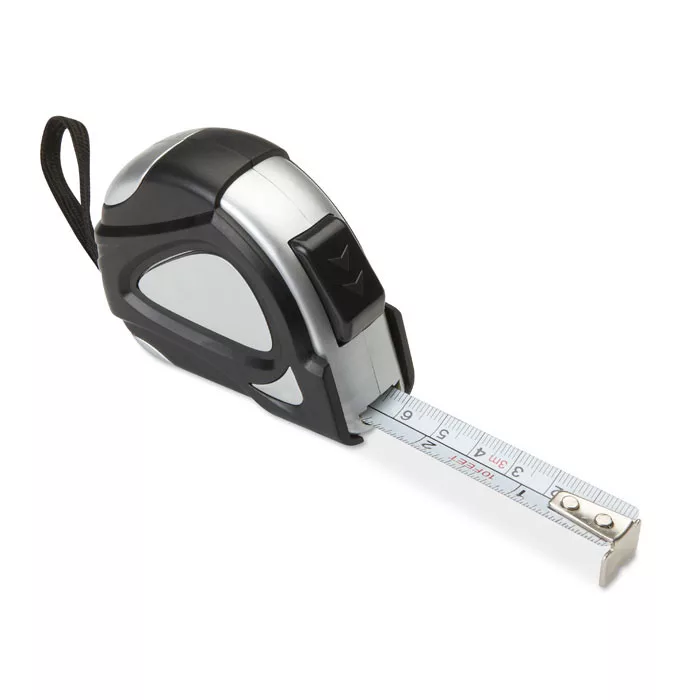 3 méteres mérőszalag ezüst és fekete házzal. ABS anyagból. Csuklópánttal és fényes, ezüstös, övre akasztható csíptetővel.