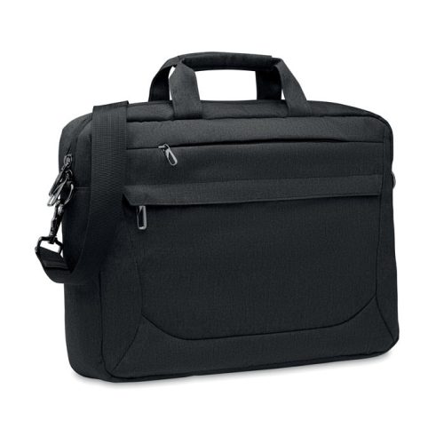 15 colos laptop táska 600D RPET poliészterből. 2 fő belső rekesz laptop vagy táblagép számára és nagy cipzáras elülső zseb, egy kis cipzáras zseb. Levehető és állítható vállpánt. Hátoldalán gurulós bőröndre illeszkedő pánttal.