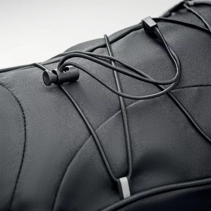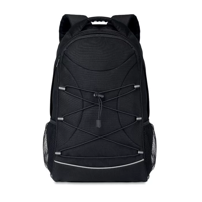 600D RPET anyagból készült hátitáska, az elején fényvisszaverő részletekkel, mindkét oldalán hálós zsebekkel.