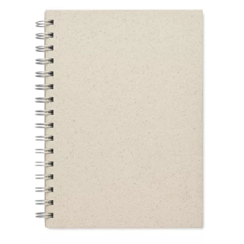 A5 fűpapír jegyzetfüzet. Fűpapír keménytáblás borító. Ikerspirálozott. 160 vonalas oldal (80 lap). 40% fűrostot tartalmazó 95 g vastag fűpapír. EU-ban gyártva.