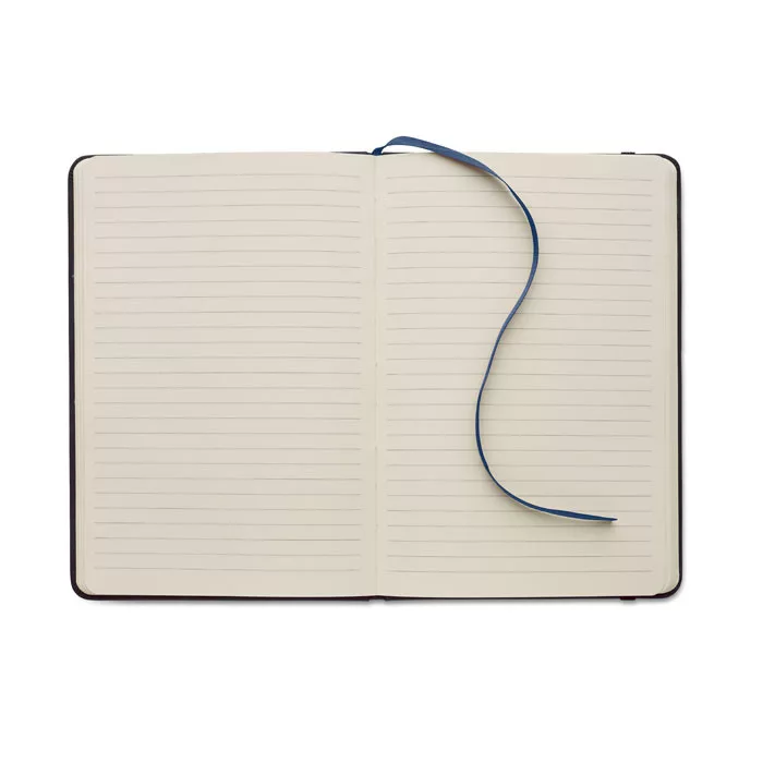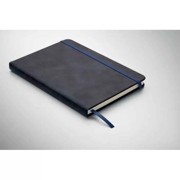 A5 jegyzetfüzet, füstös mintázatú, 40% fogyasztás utáni újrahasznosított PU és 60% PU, keménytáblás borítóval. Cérnafűzött. 160 vonalas oldal (80 lap) 70 g/m² újrahasznosított papírból. Illeszkedő színű elasztikus zárópánt és könyvjelző szalag.