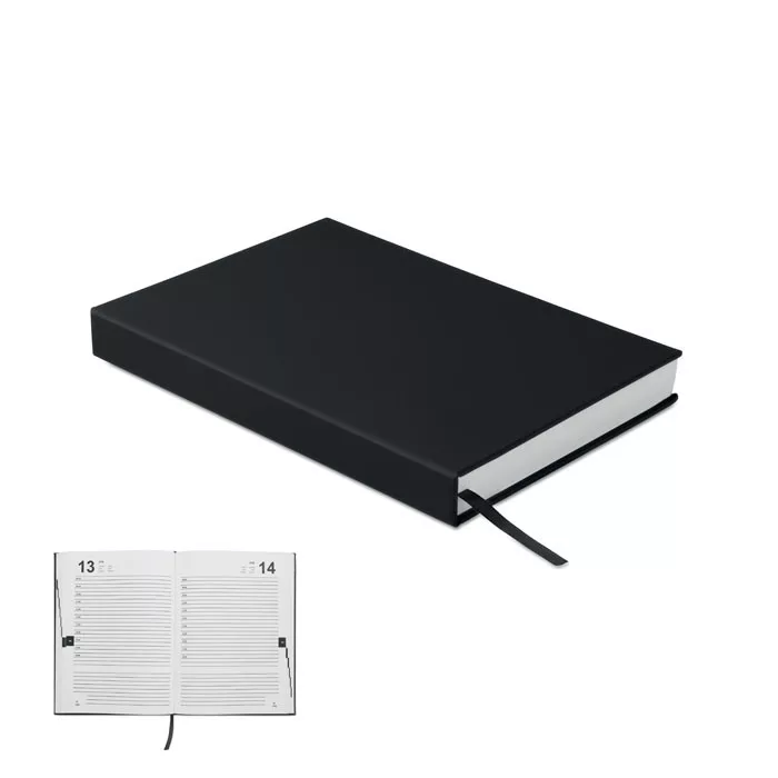 A5, napi beosztású öröknaptár, 60% fogyasztás utáni újrahasznosított poliészter és 40% PU borítóval. 416 univerzális oldal (208 lap) 70 g/m² újrahasznosított papírból. Illeszkedő színű poliészter könyvjelző szalag.