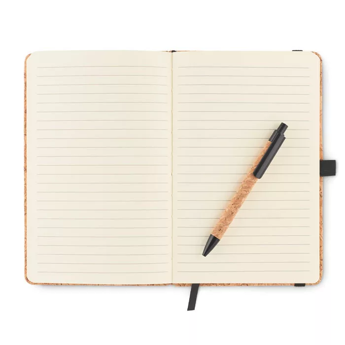 A5 parafa jegyzetfüzet, hozzáillő tollal. Parafa keménytáblás borító. Cérnafűzött. 160 vonalas oldal (80 lap). Elasztikus zárópánt és tolltartó hurok. Hozzáillő nyomógombos golyóstoll parafa tolltesttel, 50% búzaszalma és 50% PP anyagból készült szerelvényekkel. Ajándékdobozban. A parafa 100%-ban természetes anyag. Szerkezeti jellege és felületi porozitása miatt az egyes tárgyak végső emblémázási eredménye eltéréseket mutathat.