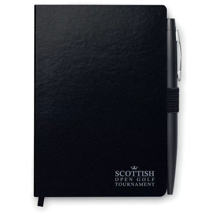 A5 jegyzetfüzet golyóstollal. PU keménytáblás borítóval. Cérnafűzött. 144 vonalas oldal (72 lap). Színben illeszkedő elasztikus zárópánt, tolltartó hurok és könyvjelző szalag. Fém nyomógombos golyóstoll, kéken író betéttel.