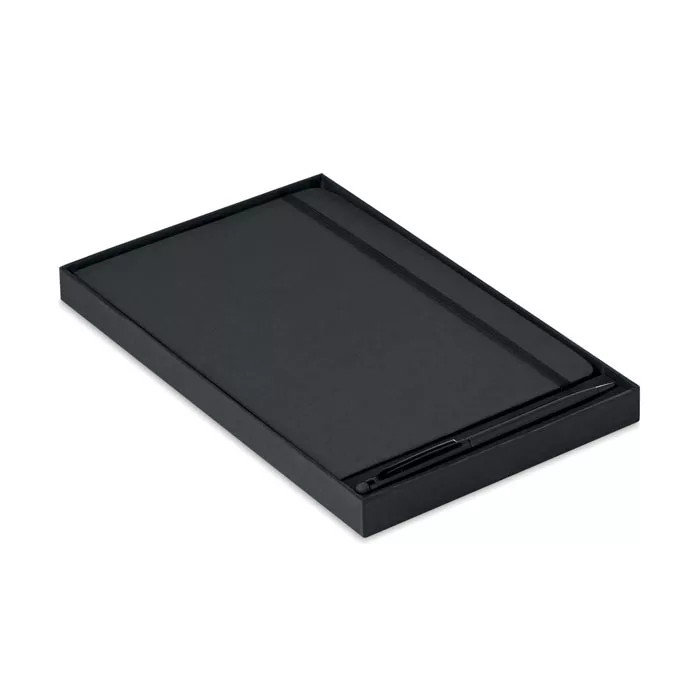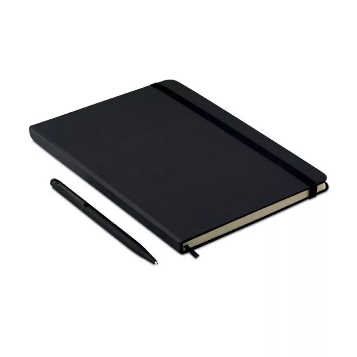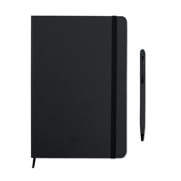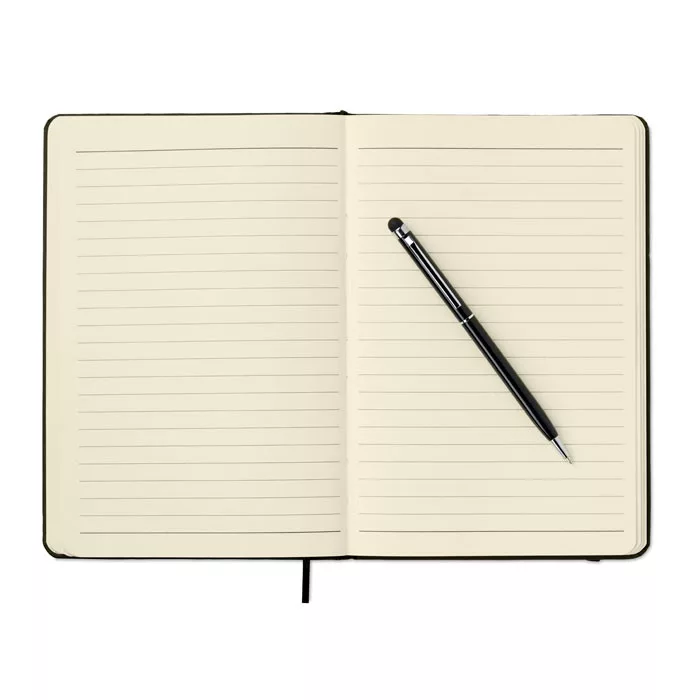A5 jegyzetfüzet érintőhegyes golyóstollal, keménytáblás borítóval. Cérnafűzött. 144 vonalas oldal (72 lap). Fekete elasztikus zárópánt és könyvjelző szalag. Színben illeszkedő érintőhegyes golyóstoll, kéken író betéttel.