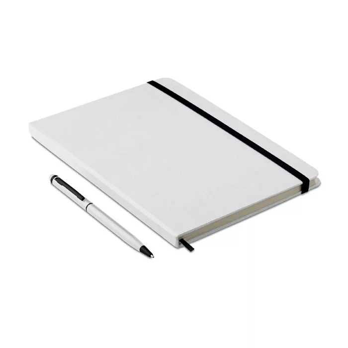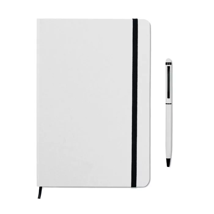A5 jegyzetfüzet érintőhegyes golyóstollal, keménytáblás borítóval. Cérnafűzött. 144 vonalas oldal (72 lap). Fekete elasztikus zárópánt és könyvjelző szalag. Színben illeszkedő érintőhegyes golyóstoll, kéken író betéttel.