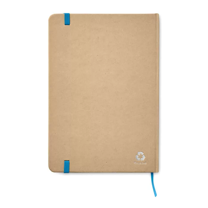 A5 jegyzetfüzet újrahasznosított karton keménytáblás borítóval. Cérnafűzött. 160 vonalas oldal (80 lap). Elasztikus zárópánt, könyvjelző szalag.