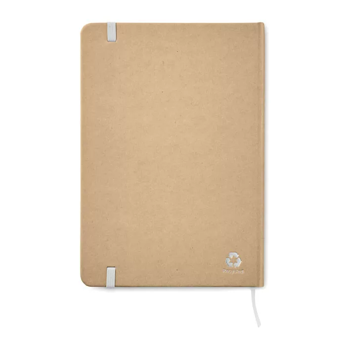 A5 jegyzetfüzet újrahasznosított karton keménytáblás borítóval. Cérnafűzött. 160 vonalas oldal (80 lap). Elasztikus zárópánt, könyvjelző szalag.