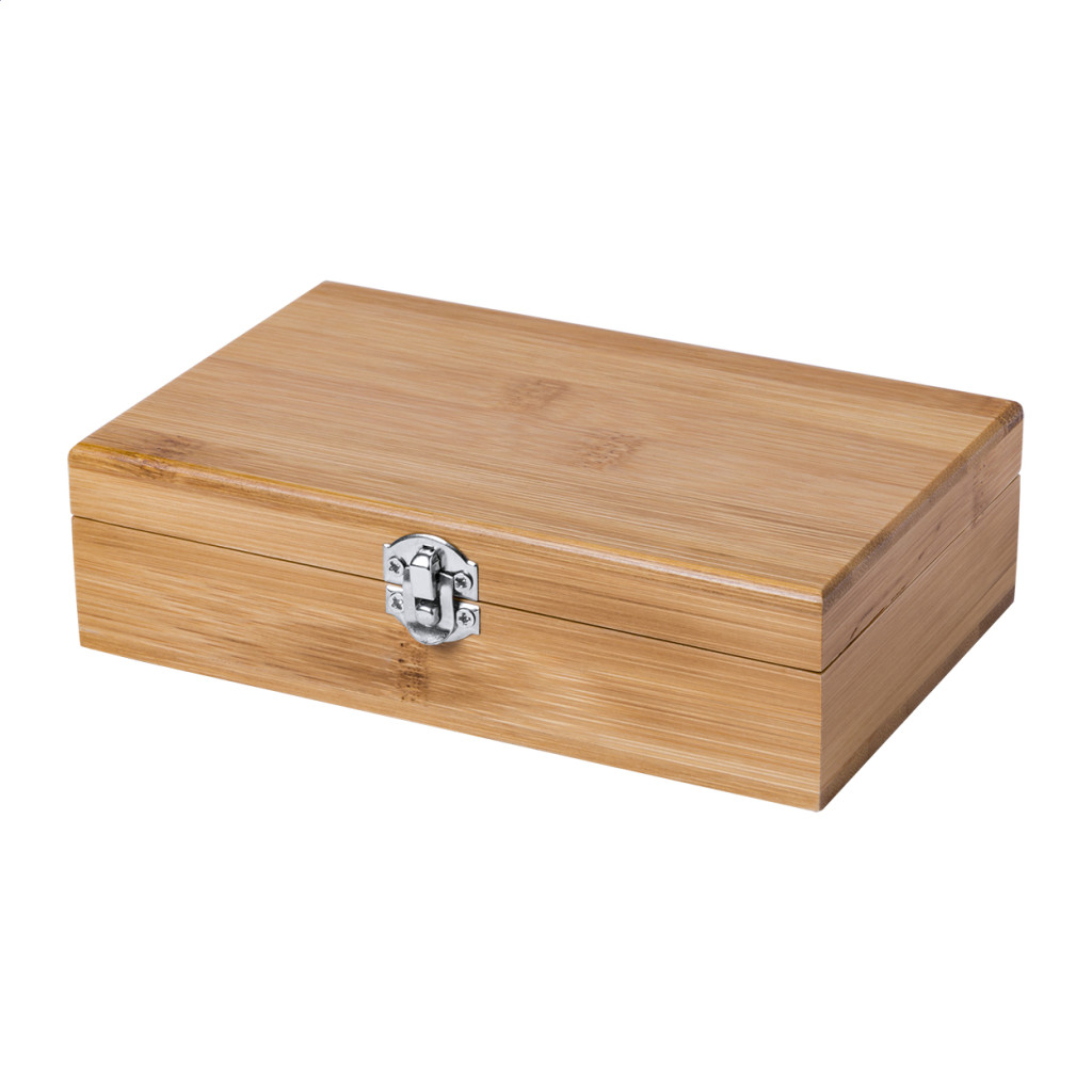 Bambusz boros szett dugóhúzóval, cseppőrrel és záródugóval bambusz dobozban.