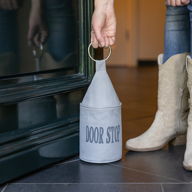 Praktikus és hangulatos lakáskiegészítő szürke színben, amely megakadályozza az ajtók becsukódását. "Door stop" felirattal rendelkezik, a rajta lévő fém karika segítségével könnyen elmozdíthatjuk. Vászon anyagának köszönhetően nem karcolja meg a padlót.