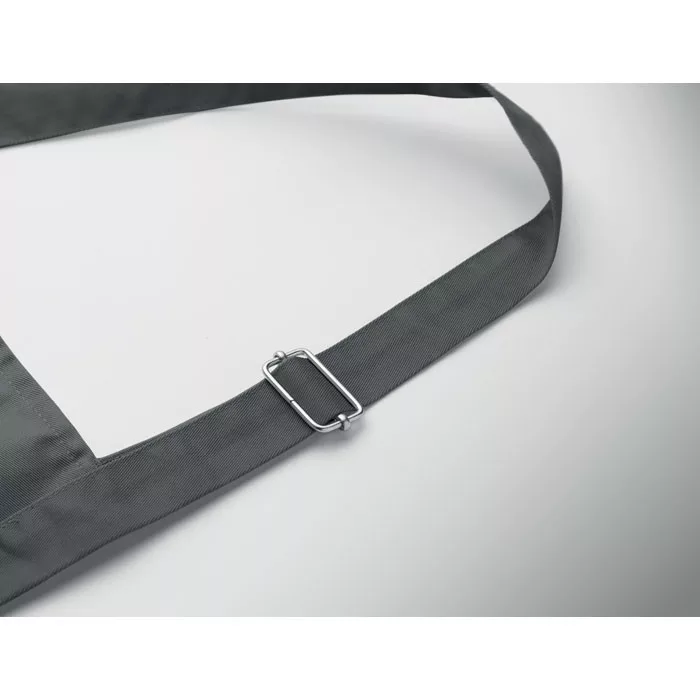 Hosszú, állítható konyhai kötény 240 g/m² poliészter-pamut anyagból (35% pamut, 65% poliészter), két elülső zsebbel és fémcsattal ellátott, állítható pánttal.