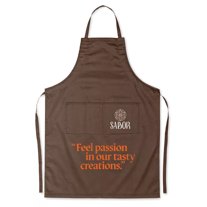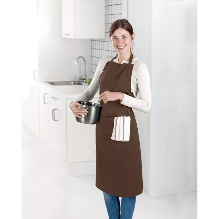 Állítható konyhai kötény 2 elülső zsebbel. 10% pamut/90% poliészter. 190 g vastag anyag.