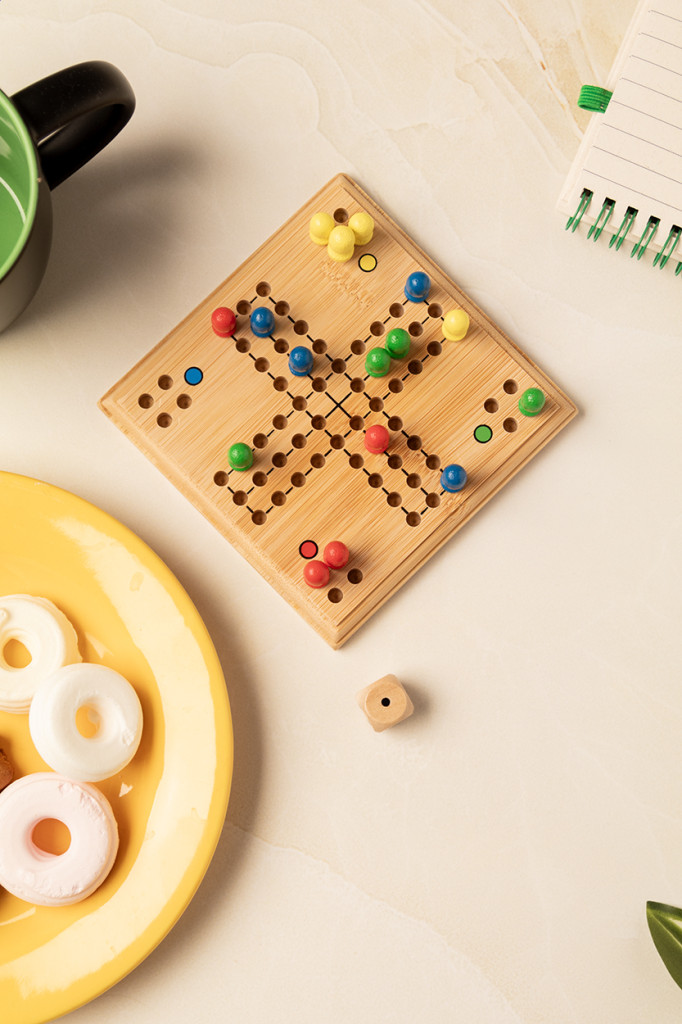 Bambusz ludo játék húzózsinóros pamut tasakban.