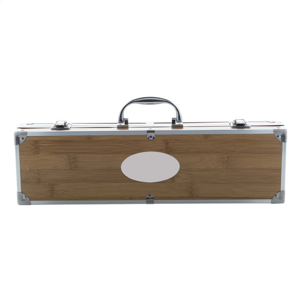 3 darabos grillszett rozsdamentes acélból és bambuszból (villa, csipesz, lapát, üvegnyitó). Bambusz mintájú alumínium tárolóban szállítjuk.
