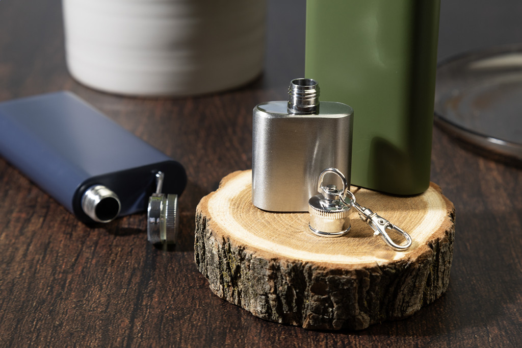 Újrahasznosított rozsdamentes acél mini flaska karabineres kulcstartóval. 30 ml.