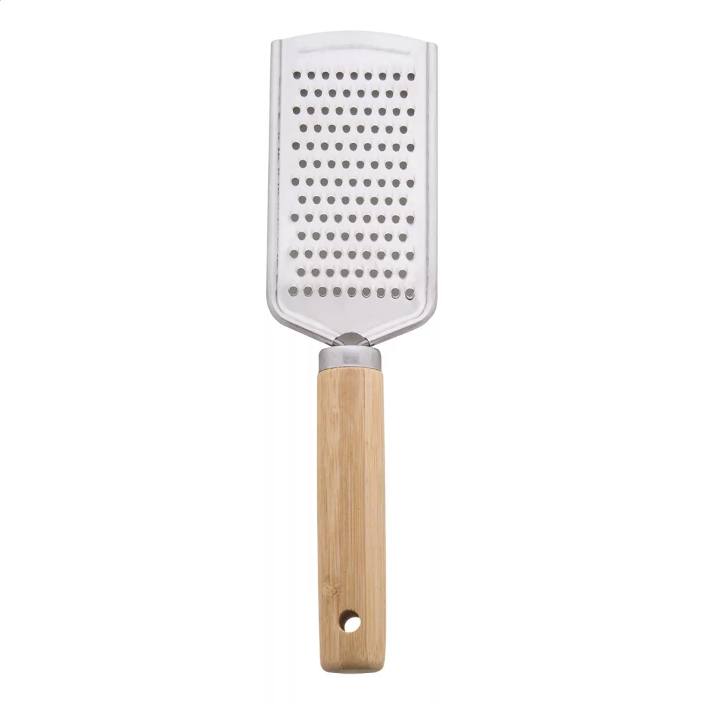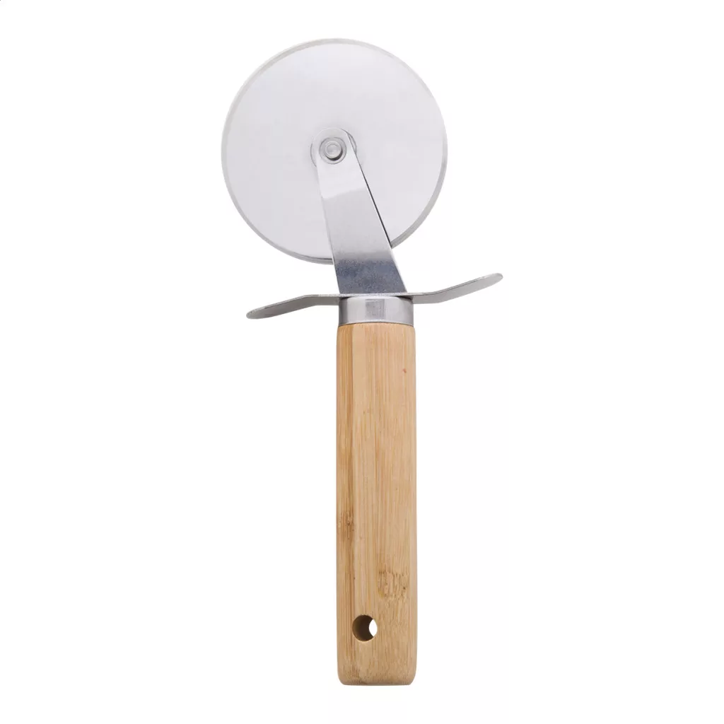 3 db-os, rozsdamentes acél pizza tálaló szett, bambusz fogantyúval, pamut tasakban. Egy sajtreszelőt, pizzavágót és spatulát tartalmaz.