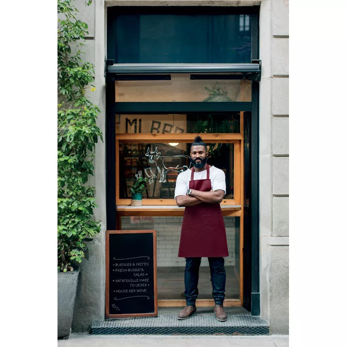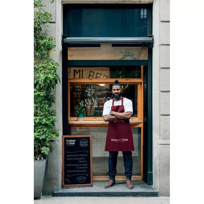 Állítható teljes kötény 1 nagy elülső, 2 rekeszre osztott zsebbel, 240 g/m² biopamutból. Gombbal állítható hosszúságú nyakpánttal.