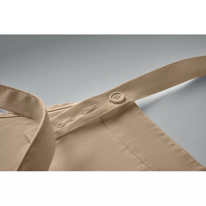 Állítható teljes kötény 1 nagy elülső, 2 rekeszre osztott zsebbel, 240 g/m² biopamutból. Gombbal állítható hosszúságú nyakpánttal. Ez a termék OEKO-TEX® STANDARD 100 tanúsítvánnyal rendelkezik.