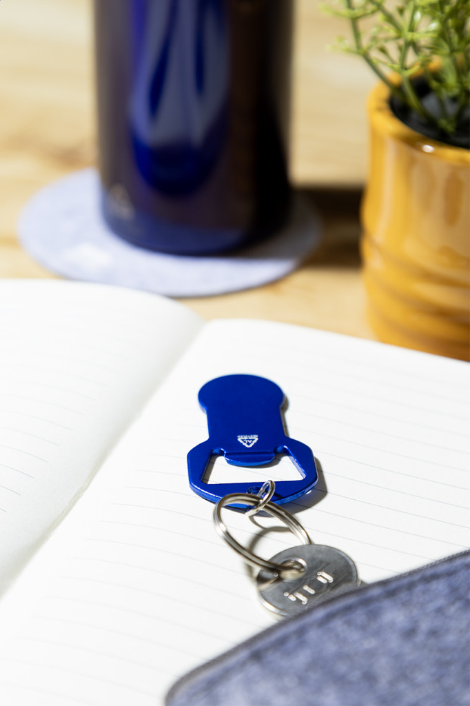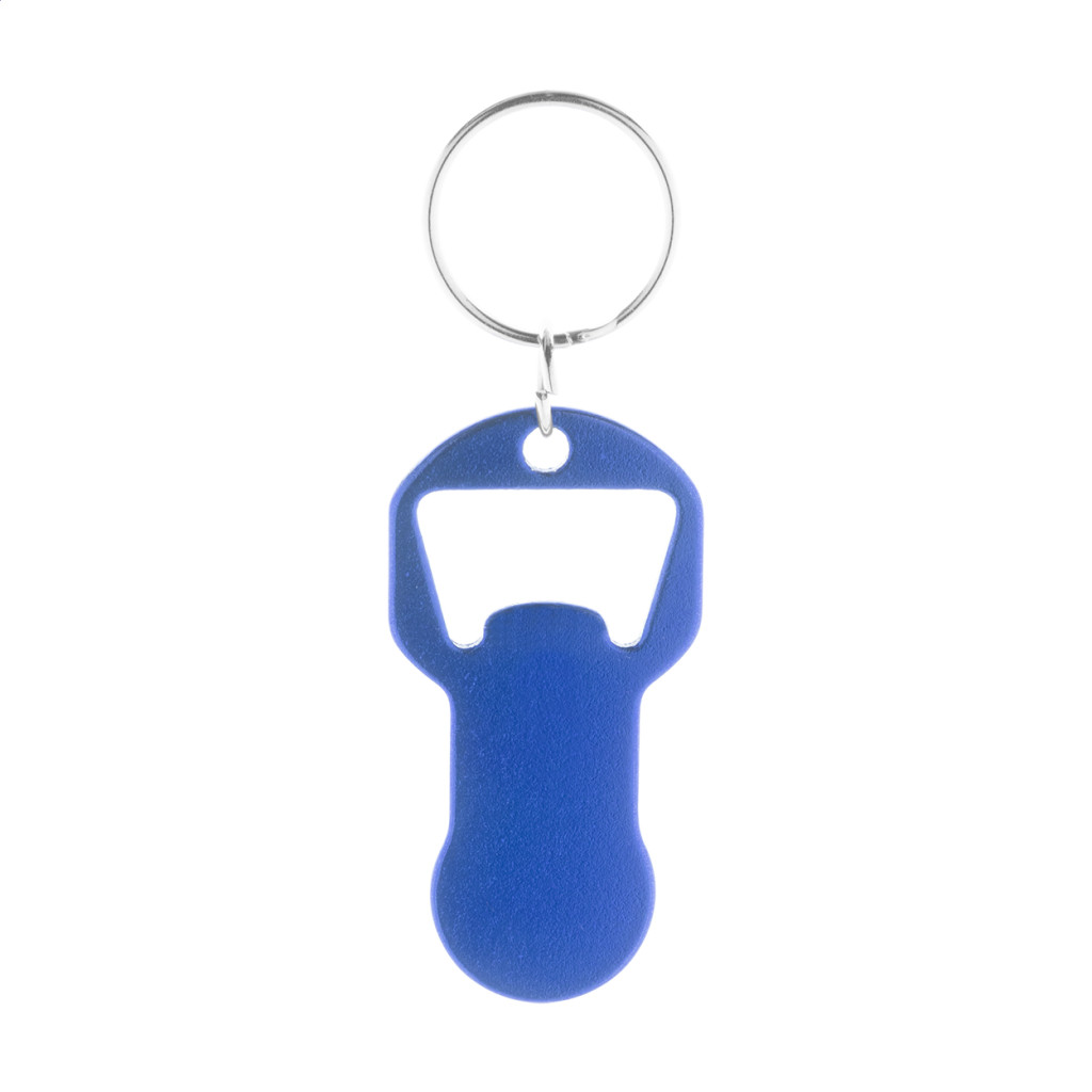 Újrahasznosított alumínium üvegnyitós kulcstartó bevásárlókocsi érmével.