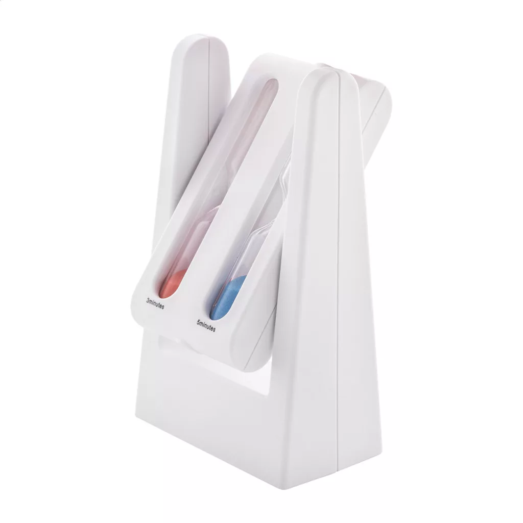 Újrahasznosított ABS műanyagból készült homokóra, forgó 3 és 5 perces homokórákkal.