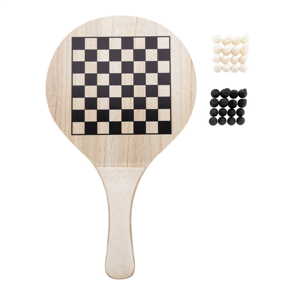 Strandtenisz 2 ütővel és egy labdával, fából és ökológiai búzaszalma műanyagból. 3 társasjátékot tartalmaz, melyeket az ütőkön lehet játszani. Pamut zsinóros tokban.