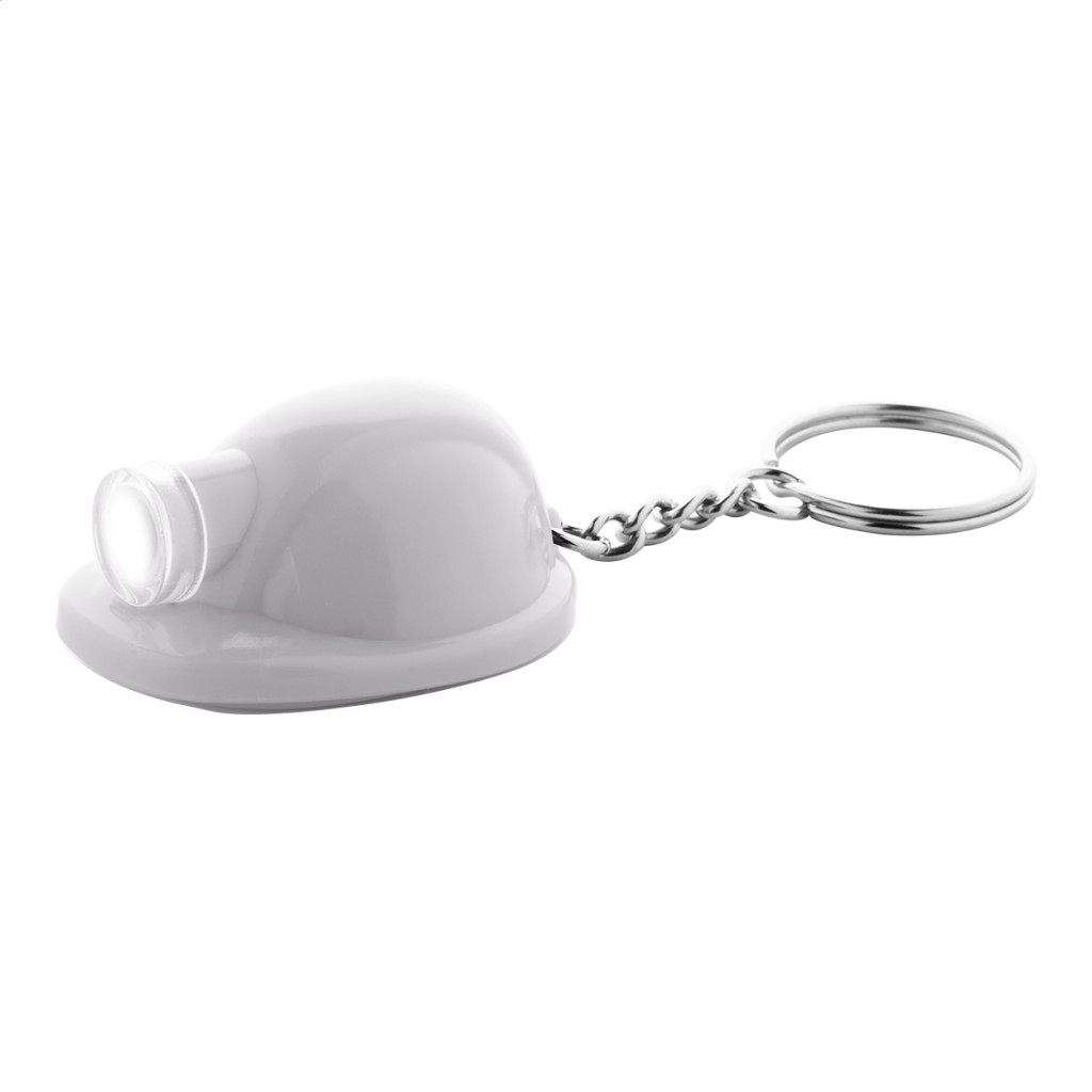 Műanyag, biztonsági sisak formájú kulcstartó LED-es lámpával. Gombelemmel szállítjuk.