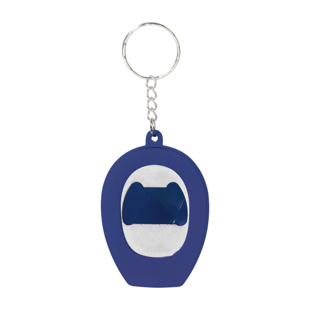 Újrahasznosított ABS műanyagból készült, sisak alakú kulcstartó üvegnyitóval.