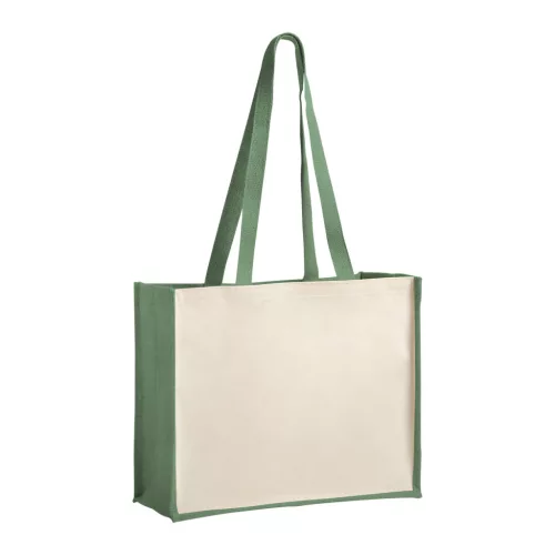 Bevásárlótáska laminált juta és laminált pamut keverékéből, hosszú hordfüllel.