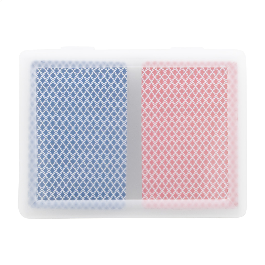 Francia kártya szett újrahasznosított PP dobozban. Két szabványos 54 lapos paklit tartalmaz piros és kék hátoldallal.