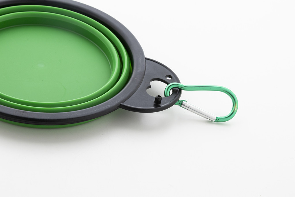 Összecsukható kutyatál TPE-ből, két 450 ml-es rekesszel és hozzá illő színű alumínium karabinerrel.