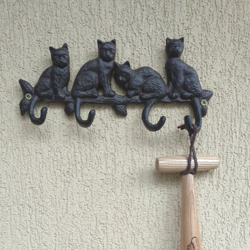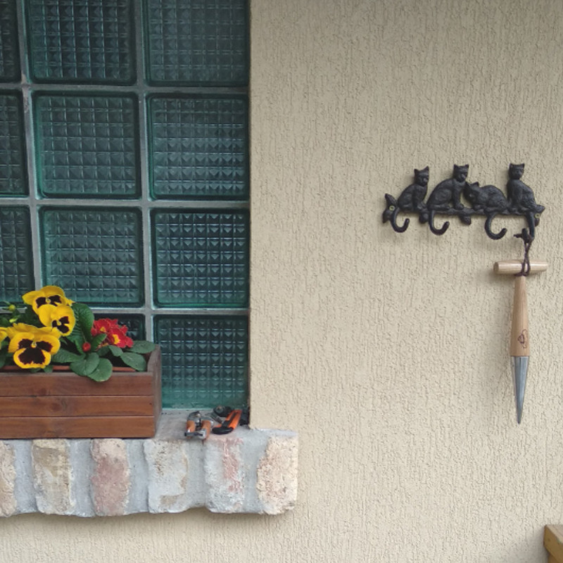 Cicákat ábrázoló négy fogasos öntöttvas akasztó. Hangulatosan mutat az előszobában, a hálószobában, a fürdőszobában vagy akár a kertben is. Benti használat során kulcsok, sálak, kabátok, táskák, konyhai textilek vagy egyéb ruhadarabok elhelyezésére is tökéletes. Kinti használat alkalmával akasszuk rá kisebb kerti eszközeinket. Öntöttvas jellegéből adódóan, külső elhelyezés esetén a korrózió megjelenésével egy patinásabb, rusztikusabb termék válik belőle. Az akasztó antik barna színben kapható, a falra könnyen felszerelhető. TIPP: A felszereléshez szükséged lesz az ehhez megfelelő kiképzésű csavarra is. A termék a csavart nem tartalmazza.