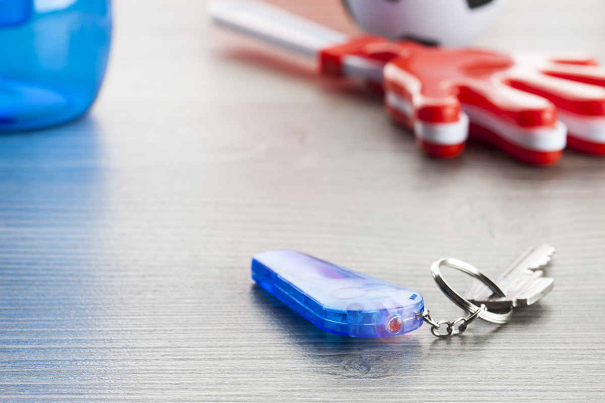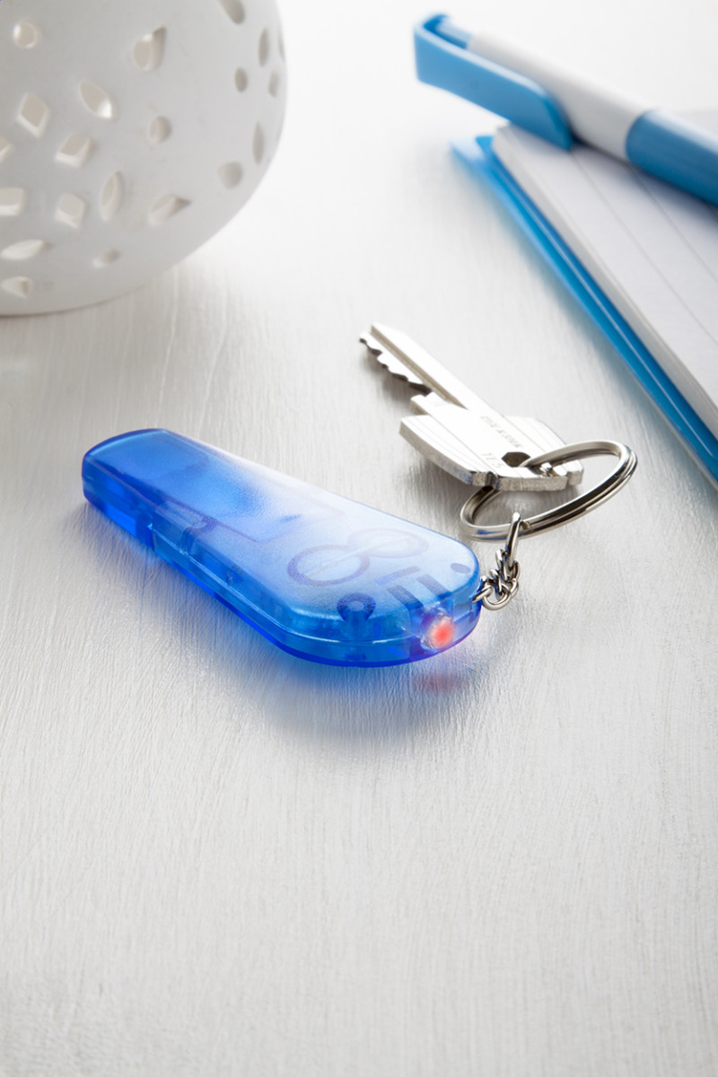 Műanyag, áttetsző síp kulcskarikával, mini lámpával, elemmel szállítjuk.