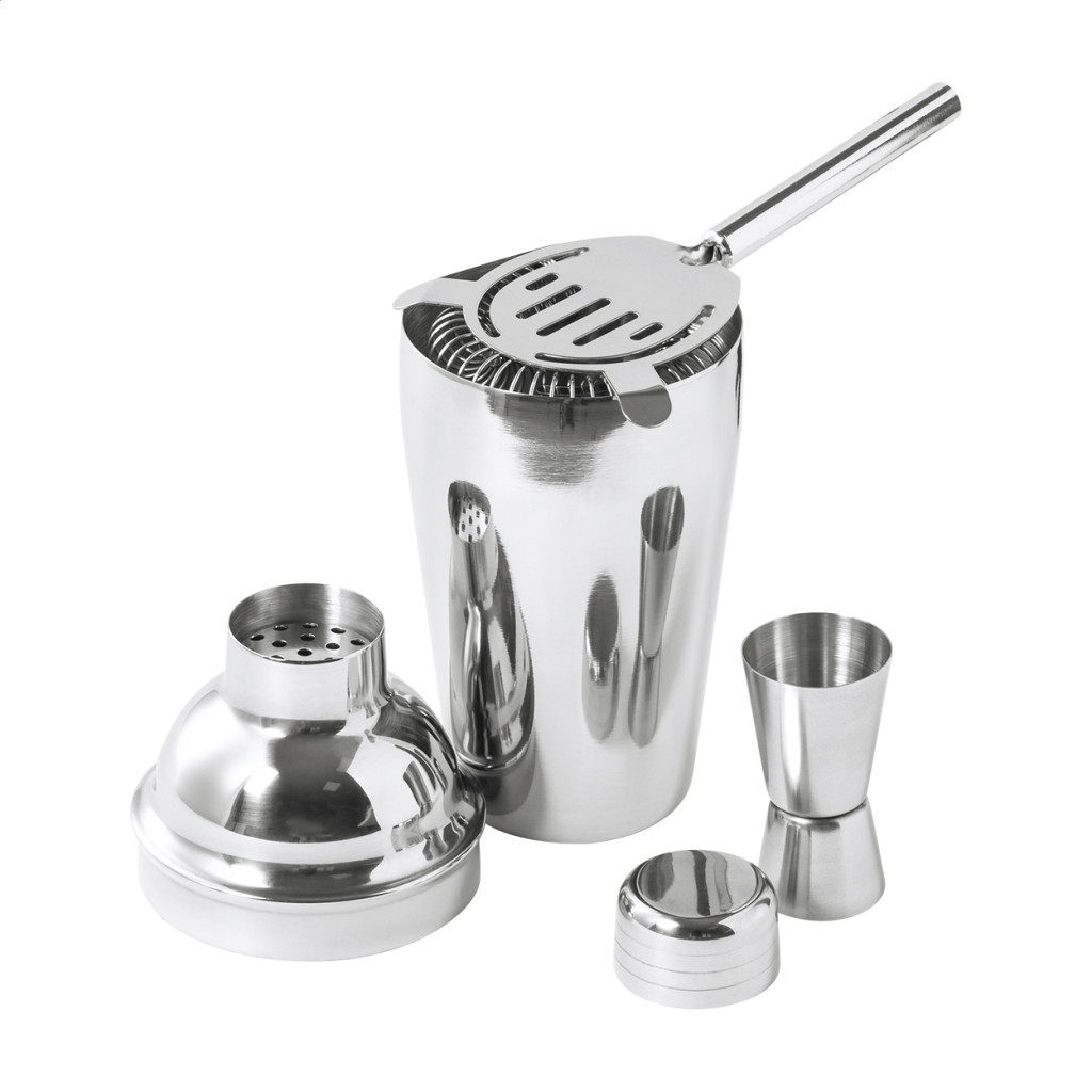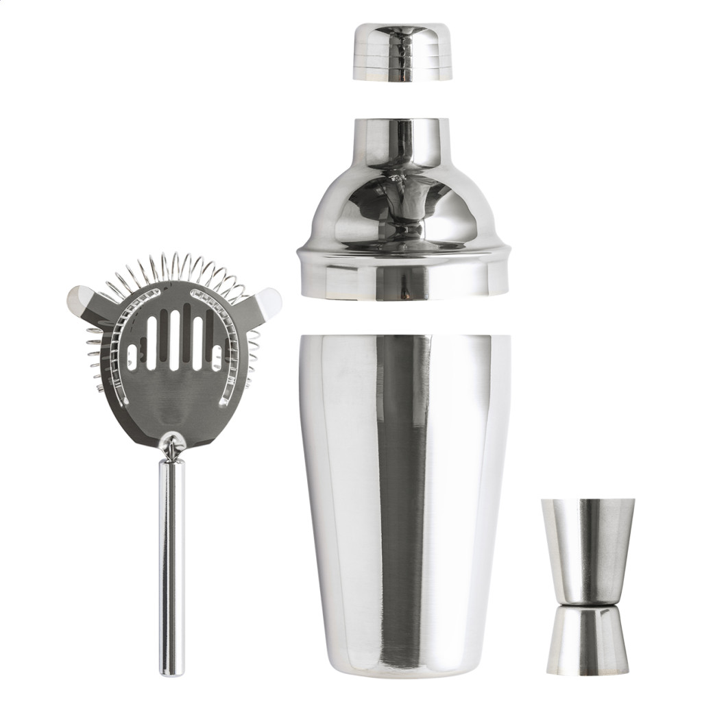 Rozsdamentes acél koktél készlet 550 ml-es shakerrel (550 ml), mérőpohárral és szűrővel.