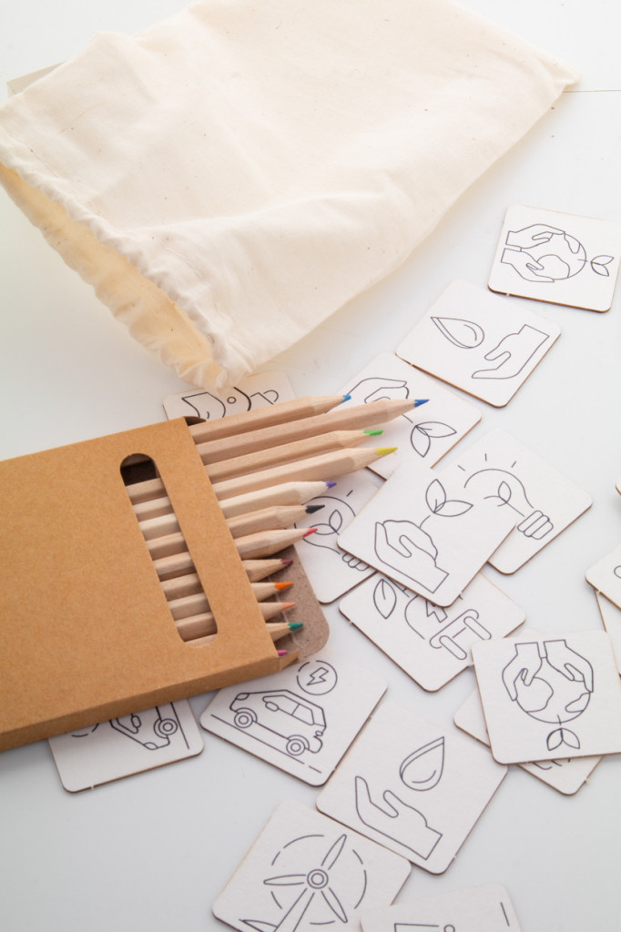 Színezős memóriajáték pamut hordtáskában. Tartalmaz 24 db tematikus, kartonból készült memóriajátékot és 12 db fa színes ceruzát papírdobozban.