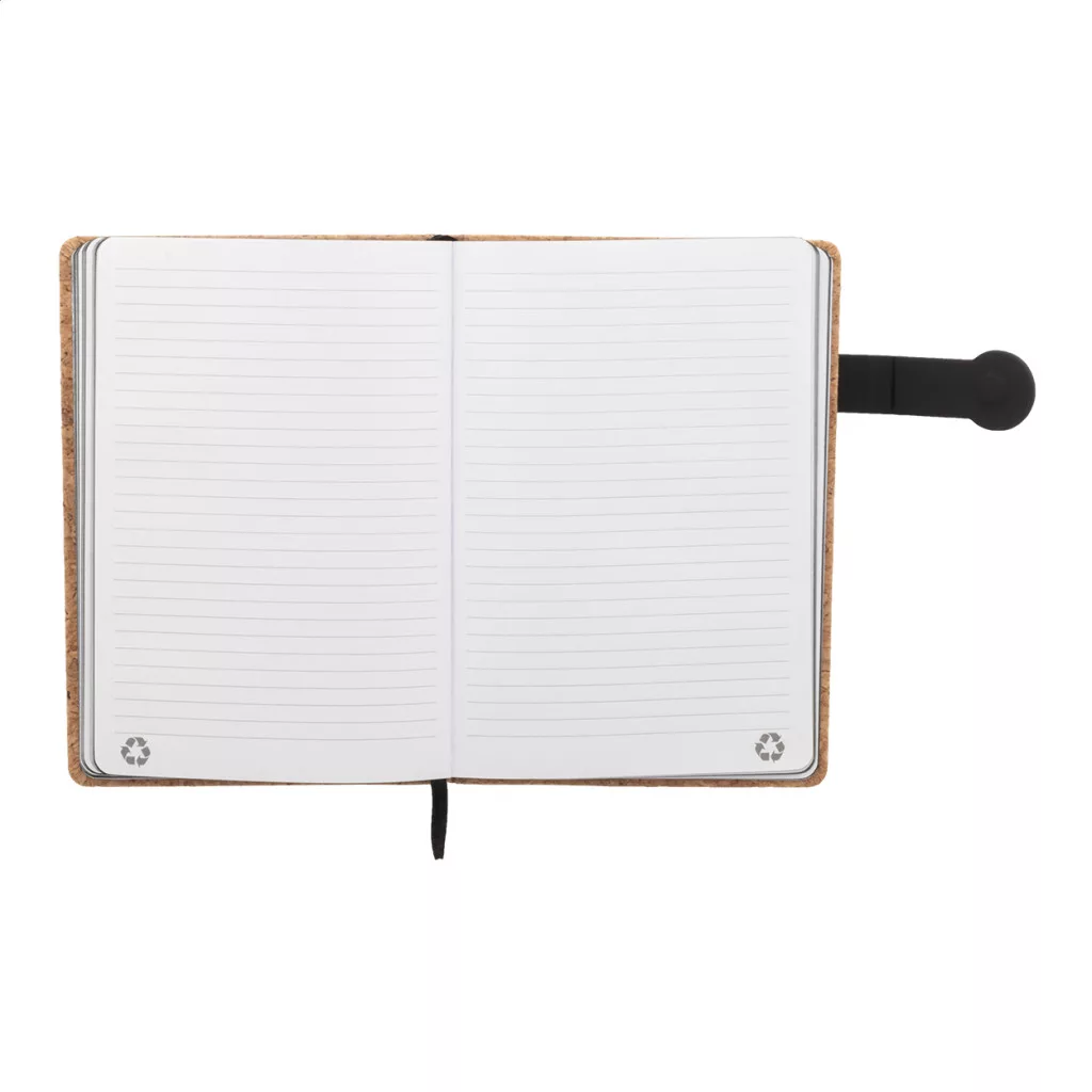 Természetes parafa és újrahasznosított PU bőr borítású jegyzetfüzet mágneses zárással, könyvjelzővel és 80 újrahasznosított papírból készült vonalas lappal, színes oldalakkal. A5 méretű.