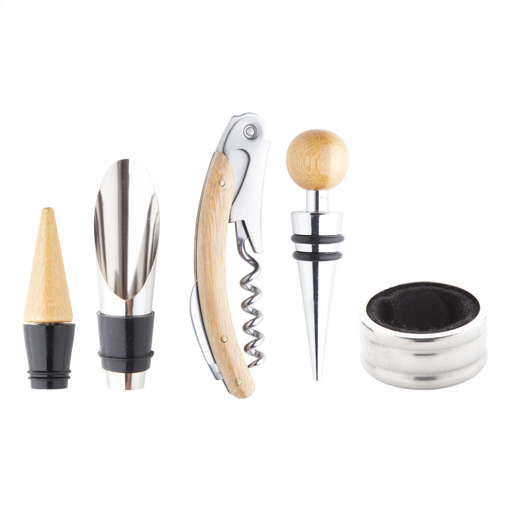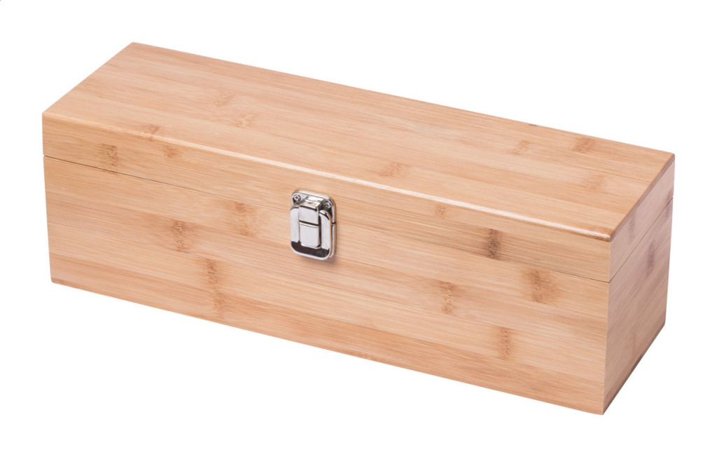 Bambusz boros szett dugóhúzóval, cseppőrrel, kiöntővel és záródugóval. Bambusz dobozban külön rekesszel egy üveg bornak. Üveg nélkül szállítjuk.