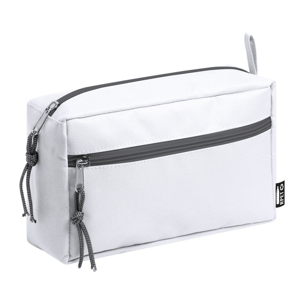 RPET kozmetikai táska 2 cipzáras rekesszel, 600D RPET poliészter. Megkülönböztető RPET címkével.