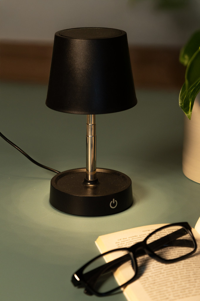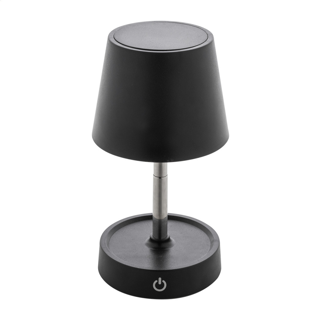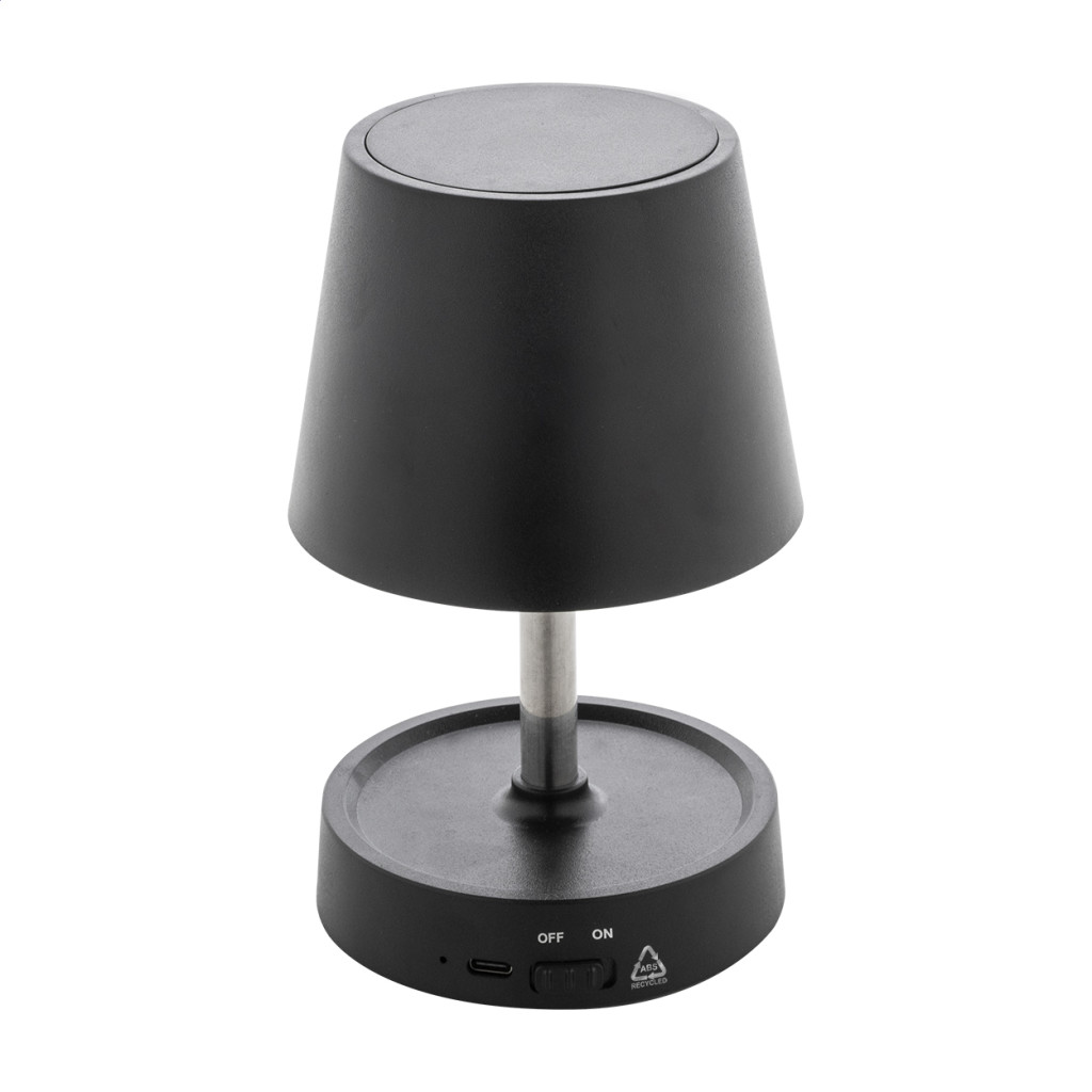 Teleszkópos asztali lámpa újrahasznosított ABS műanyagból, 12 LED-del, állítható fényerővel és 1200 mAh-s USB újratölthető akkumulátorral. USB töltőkábellel.