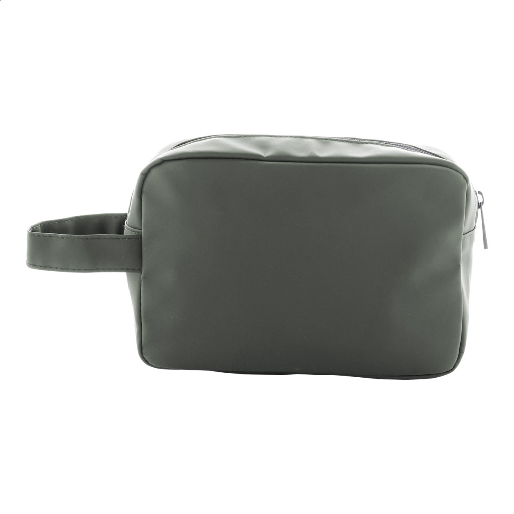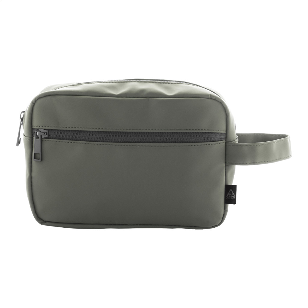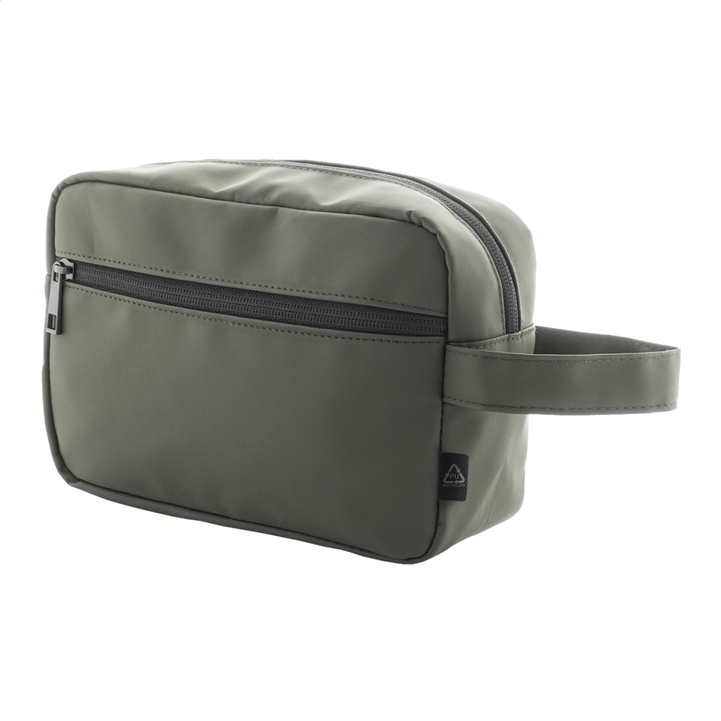 Puha újrahasznosított PU bőrből készült kozmetikai táska két cipzáras rekesszel és fogantyúval. Megkülönböztető újrahasznosított PU bőr címkével.