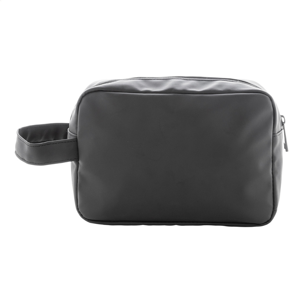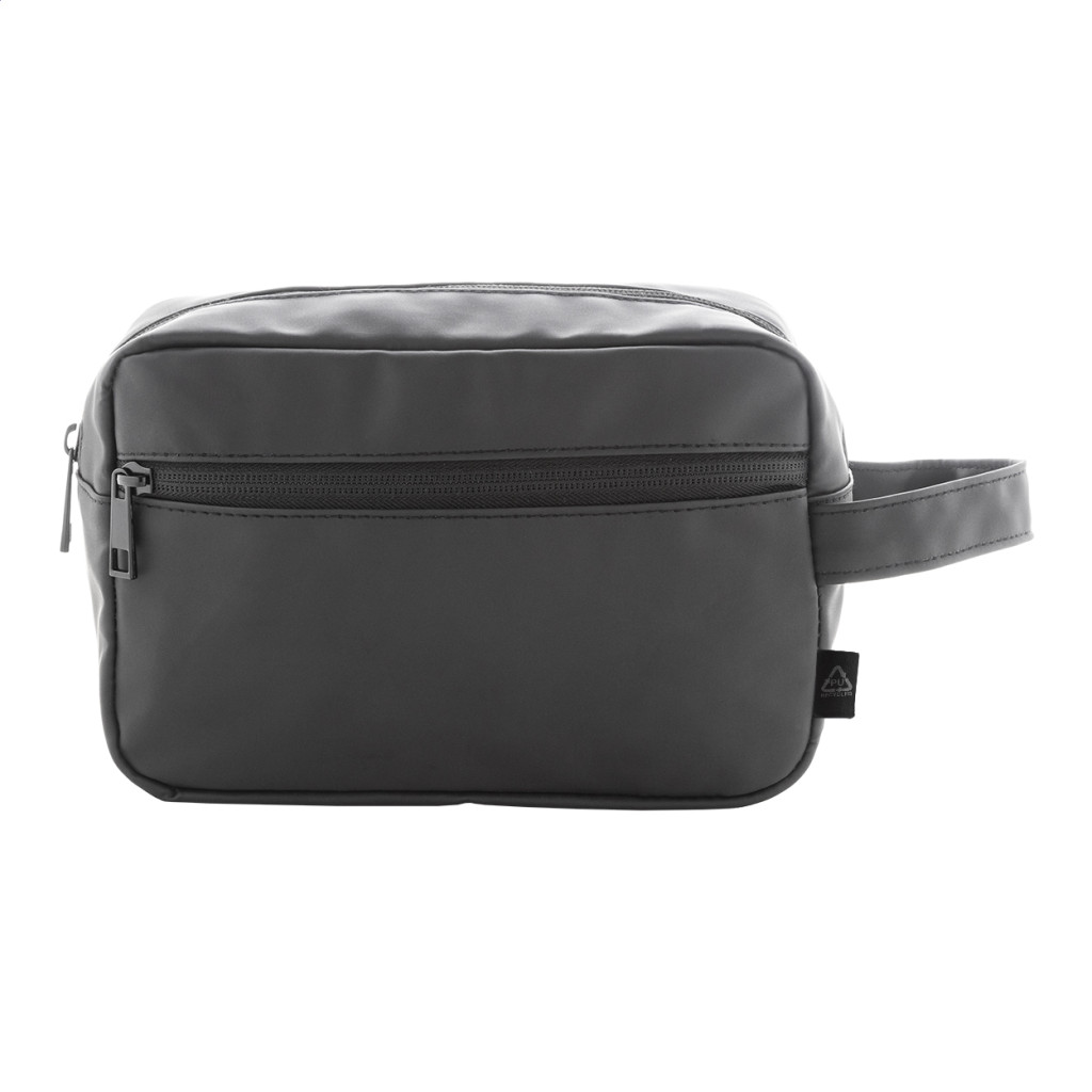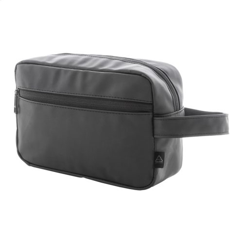 Puha újrahasznosított PU bőrből készült kozmetikai táska két cipzáras rekesszel és fogantyúval. Megkülönböztető újrahasznosított PU bőr címkével.