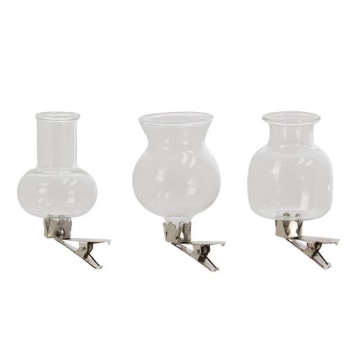 Csiptethető üveg váza, dekorációs kiegészítő, 3 db-os. A csiptethető üveg vázák modern és letisztult megjelenésükkel kifinomultságot sugároznak minden helyiségben. Ezek a bájos üvegvázák különleges sokoldalúsággal bírnak, könnyedén illeszkedve a különféle dekorációs stílusokhoz. A csiptethető megoldásnak köszönhetően a virágok elrendezése egyszerű és élvezetes élmény lehet.