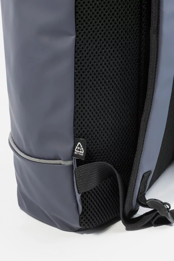 Vízálló, puha, újrahasznosított PU műbőrből készült rolltop hátizsák cipzáras, csattal záródó fő rekesszel, vízálló cipzáras elülső zsebbel, párnázott laptop (15") rekesszel és fényvisszaverő csíkkal. Párnázott hátrésszel és vállpántokkal. Megkülönböztető újrahasznosított PU címkével.