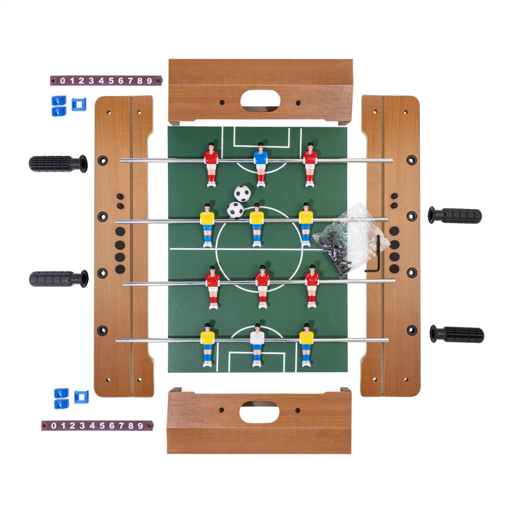 MDF fából készült mini asztali csocsó. 2 labdát és pontszámláló csúszkákat tartalmaz. Lapra szerelve szállítjuk, összeszerelést igényel.