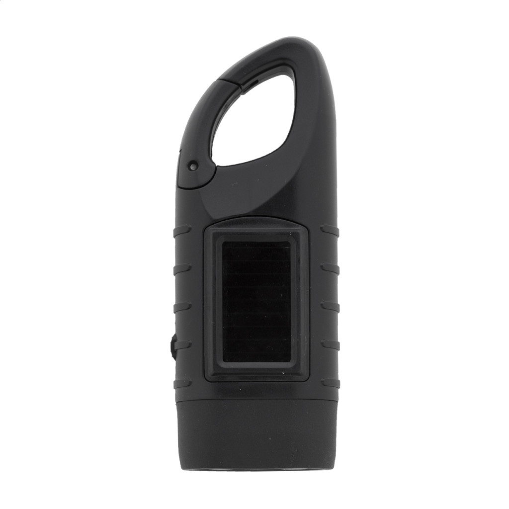 Újrahasznosított ABS műanyagból készült elemlámpa 3 LED-del, beépített napelemes és dinamós töltővel, karabineres csipesszel.