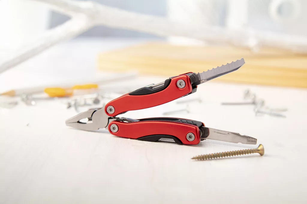 Rozsdamentes acél multiszerszám, 12 funkcióval, poliészter tokkal.