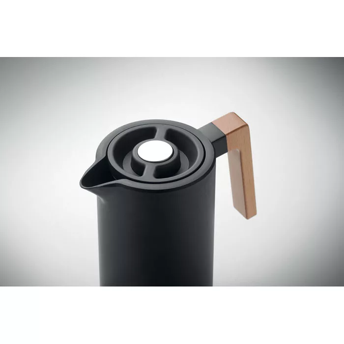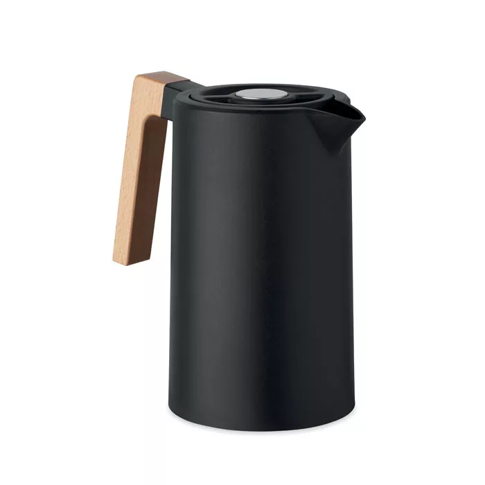 Duplafalú termoszkanna újrahasznosított rozsdamentes acél (90% újrahasznosított rozsdamentes acél és 10% rozsdamentes acél) belső és PP külső fallal, fa füllel.